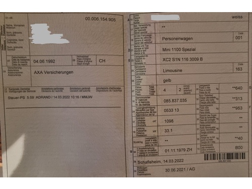 Es gibt einen neuen Satz Winterpneu und diverse Ersatzteile dazu. Momentan ist der Mini noch eingelöst, und bei schönem Wetter schaue ich, dass ich ihn ein bisschen fahren kann, um Standschäden zu vermeiden.; ; Bei fragen können sie sich gerne melden.; DI